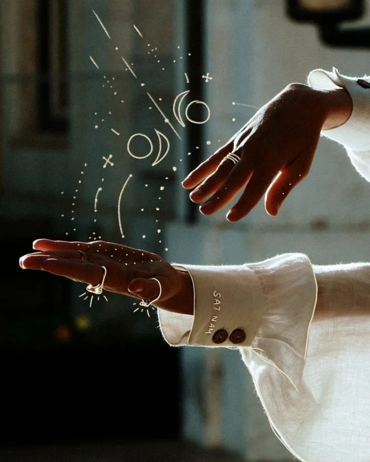 Minimalist bathroom with a floating stone sink, black faucet, soap dish, neatly folded towels, small brush, and a hanging pendant light on a white wall.